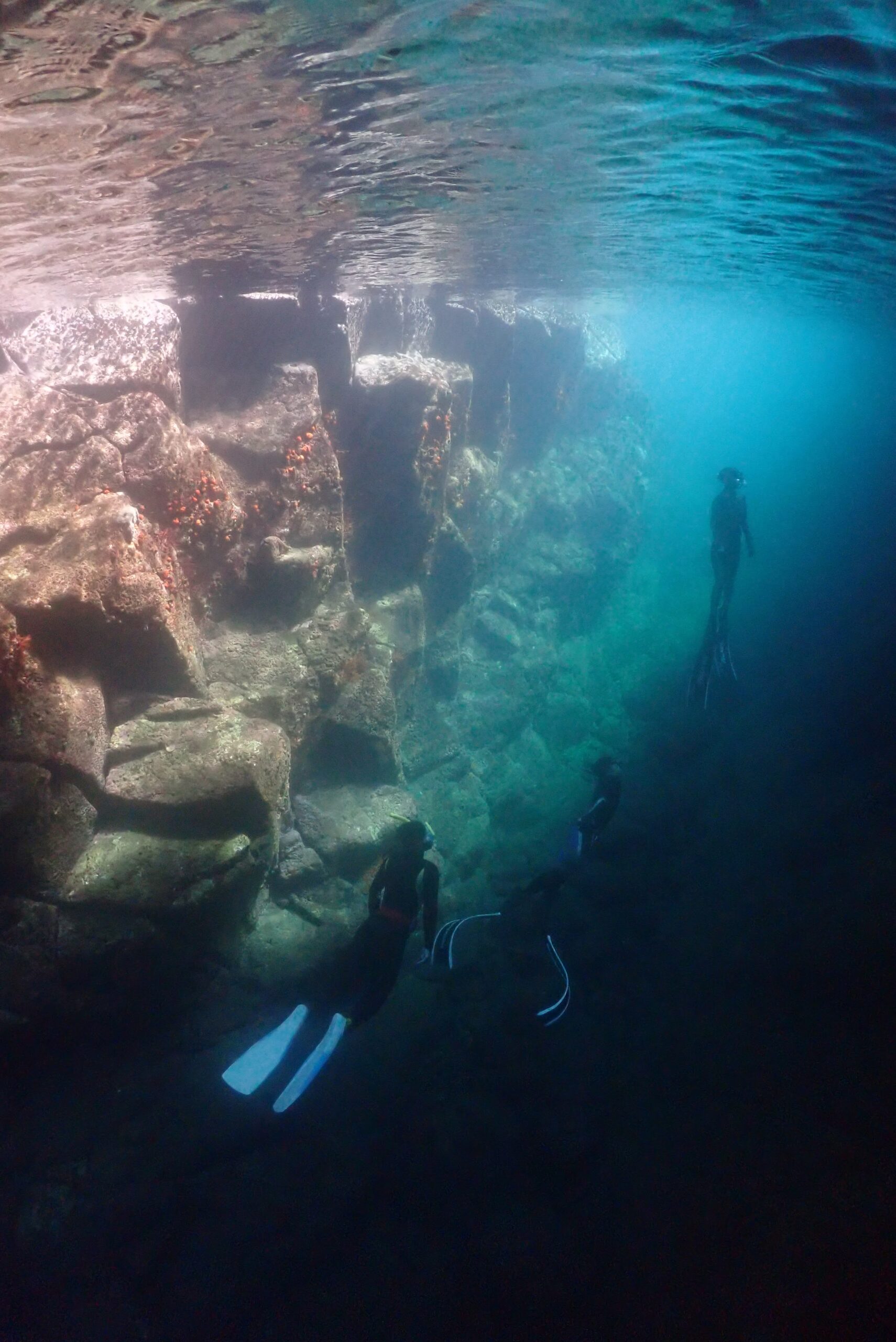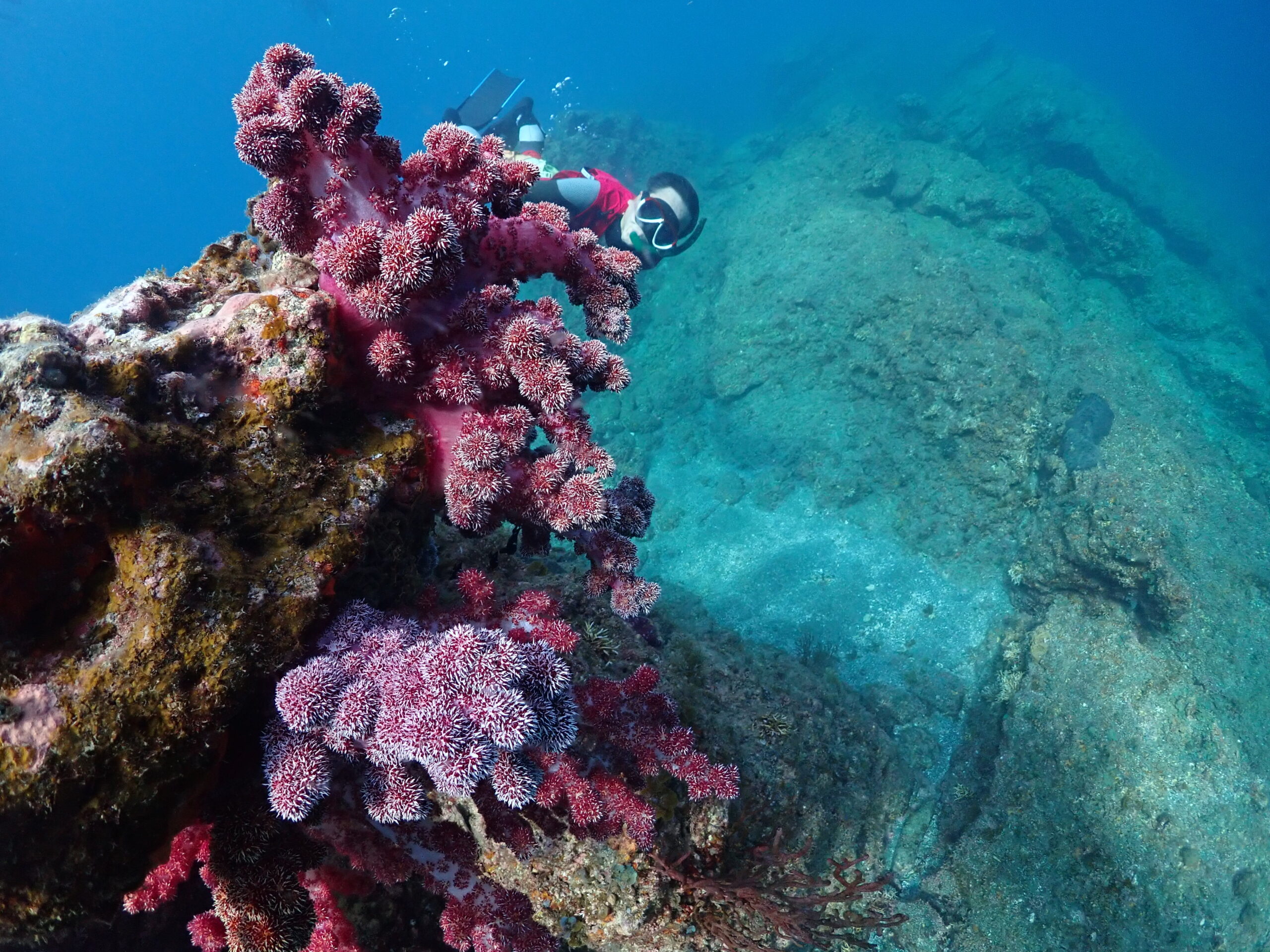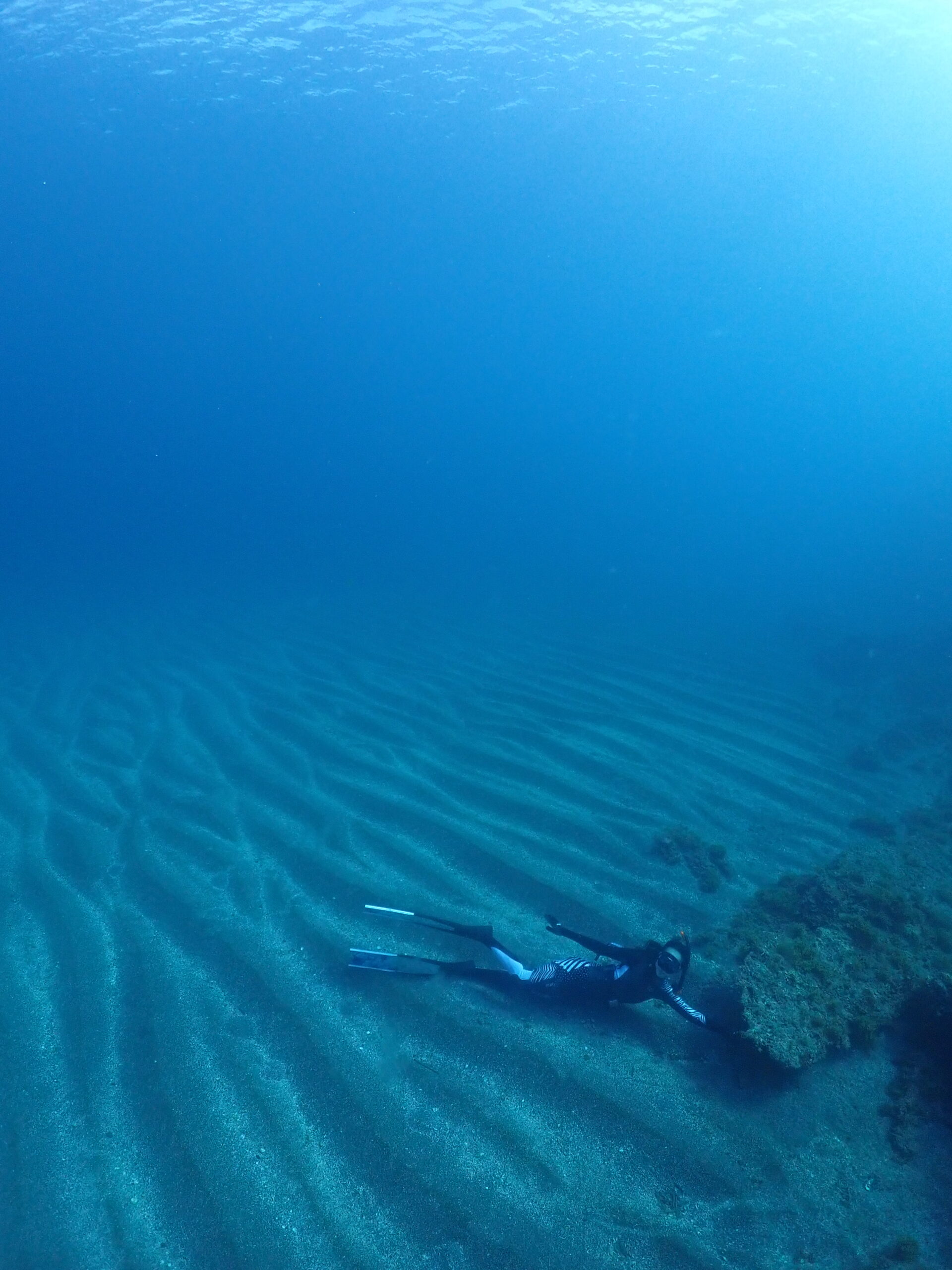 スキンダイビングポイントとしては夏に1か月だけオープンする「谷川浜」水深5~10mほどのポイントはスキンダイビングにちょうどいい遊び場です♪砂地~大きな根まで地形が楽しすぎる!!そしてスタッフお勧めなのは「柱状節理」