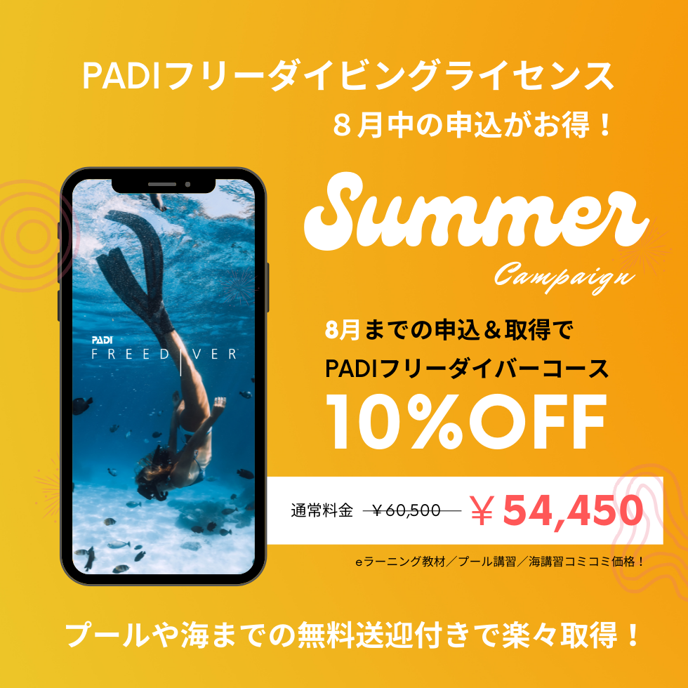 PADIフリーダイバーコースは、スキンダイビングやドルフィンスイムを安全に楽しむために基本知識、スキルを学ぶコース。趣味にするなら必ず受講をオススメしております。