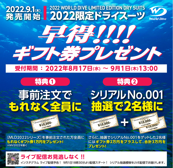 ワールドダイブ社からお得な情報が!8月17日~8月31日までの間に先行オーダーを頂いた方に、もれなく1万円商品券プレゼント、抽選で3万円の商品券が当たるかも!!