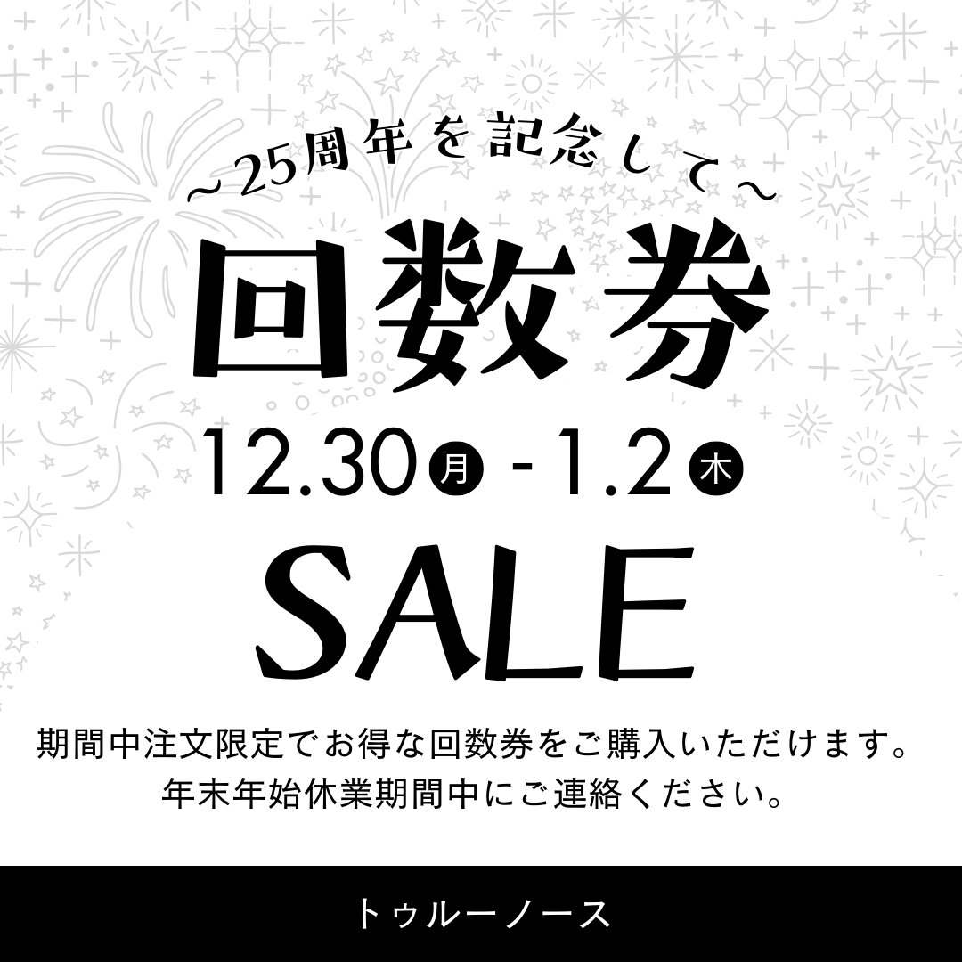 トゥルーノースでは25周年を記念して、今年限定で特別回数券の販売をいたします。このブログをご覧いただいた方限定です。休業期間中にLINE、メールでお申し込みいただければお得な回数券をご購入いただけます。ぜひこの機会をご利用ください。
