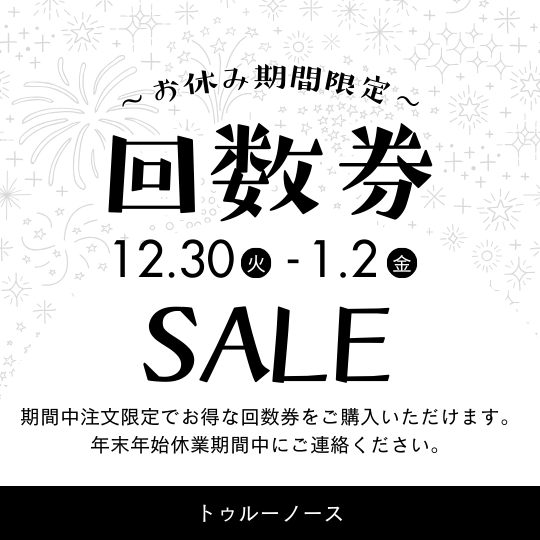 トゥルーノースでは年末年始休業期間限定で特別回数券の販売をいたします。このブログをご覧いただいた方限定です。休業期間中にLINE、メールでお申し込みいただければお得な回数券をご購入いただけます。ぜひこの機会をご利用ください。