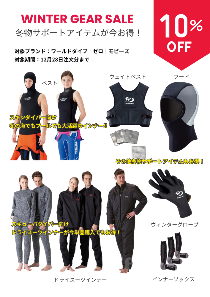 スキューバの方はドライスーツインナーやフード、ウィンターグローブ、スキンダイバーの方はウェットスーツにもう1枚足すと冬の海も行けるフードベストなど、この時期ならではのアイテムが全品10%OFFです!