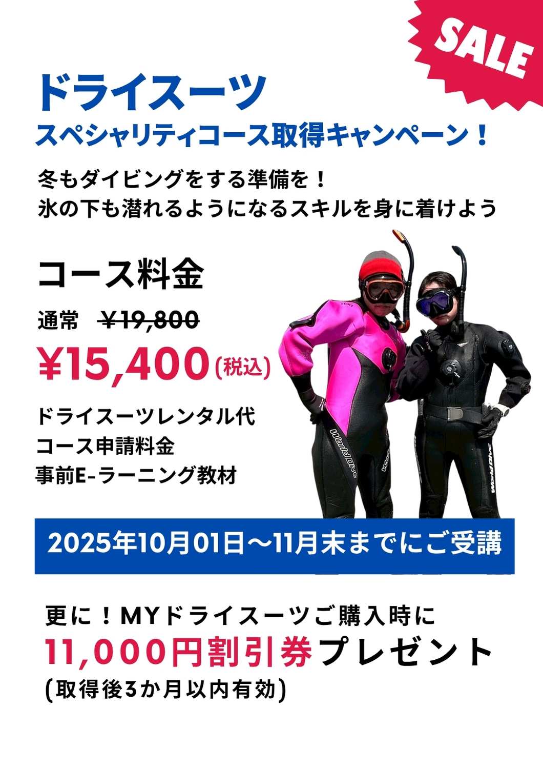 ライセンス取得後はドライスーツご購入時に使用可能な割引チケット11,000円をプレゼント(期