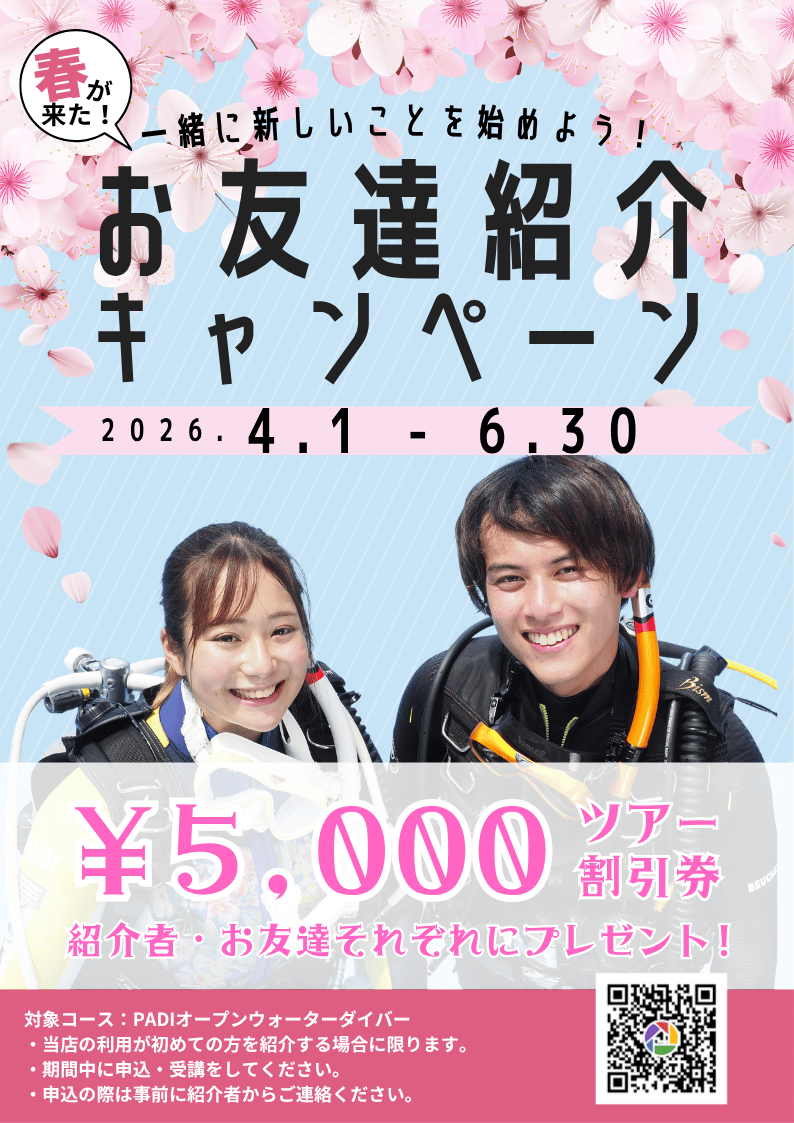 お友達をご紹介ください!今なら上記のライセンスキャンペーンに追加で紹介したも紹介された人もツアー割引券プレゼント!